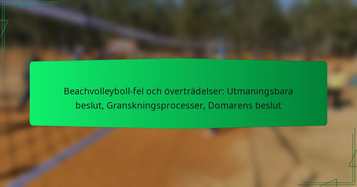 Beachvolleyboll styrs av en uppsättning specifika foul och överträdelser som kan påverka matchens utgång i stor utsträckning. Att förstå dessa överträdelser är avgörande för både spelare och åskådare, eftersom de kan leda till straff eller poängavdrag. Lag har möjlighet att ifrågasätta vissa domarbeslut från domaren, särskilt de som kan förändra spelets gång, och en granskningsprocess finns för att säkerställa noggrannhet och rättvisa i dömandet.